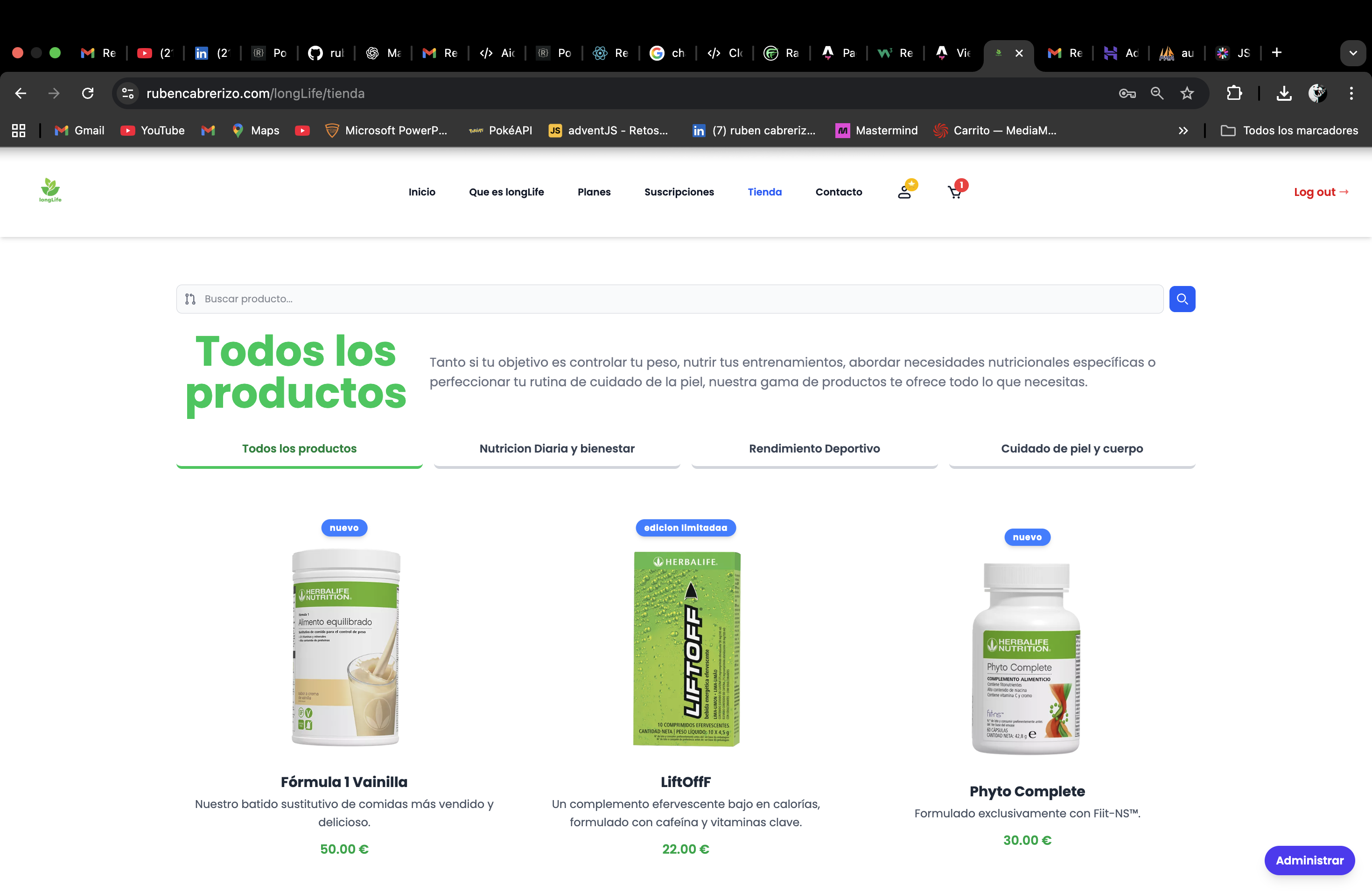 Desarrollar una experiencia de compra fluida y atractiva que permitiera a los usuarios navegar por productos nutricionales, visualizar detalles y realizar compras de forma sencilla. Se implementó un catálogo dinámico con filtrado, carrito de compras y proceso de checkout optimizado.